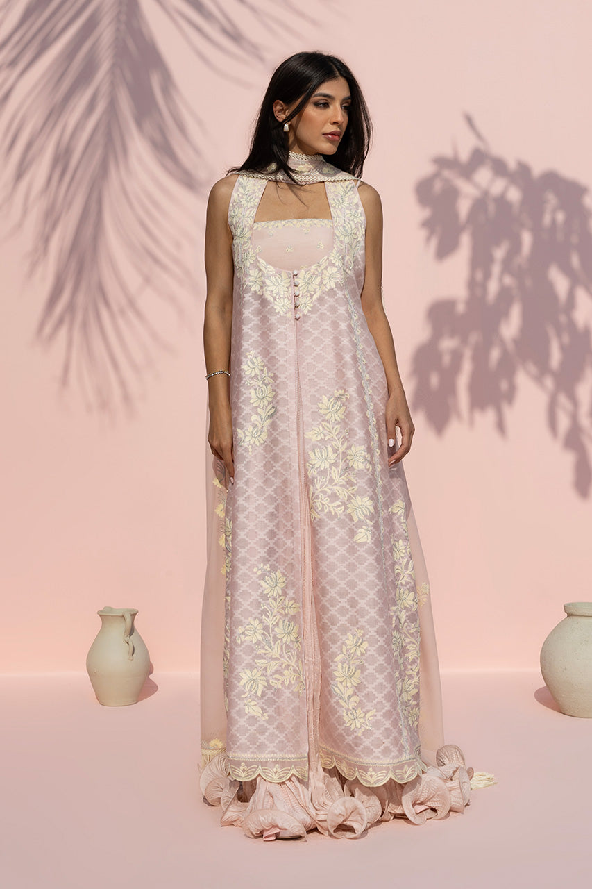 A sophisticated blush ensemble features a sleeveless, front open shirt crafted in cotton net, intricately...