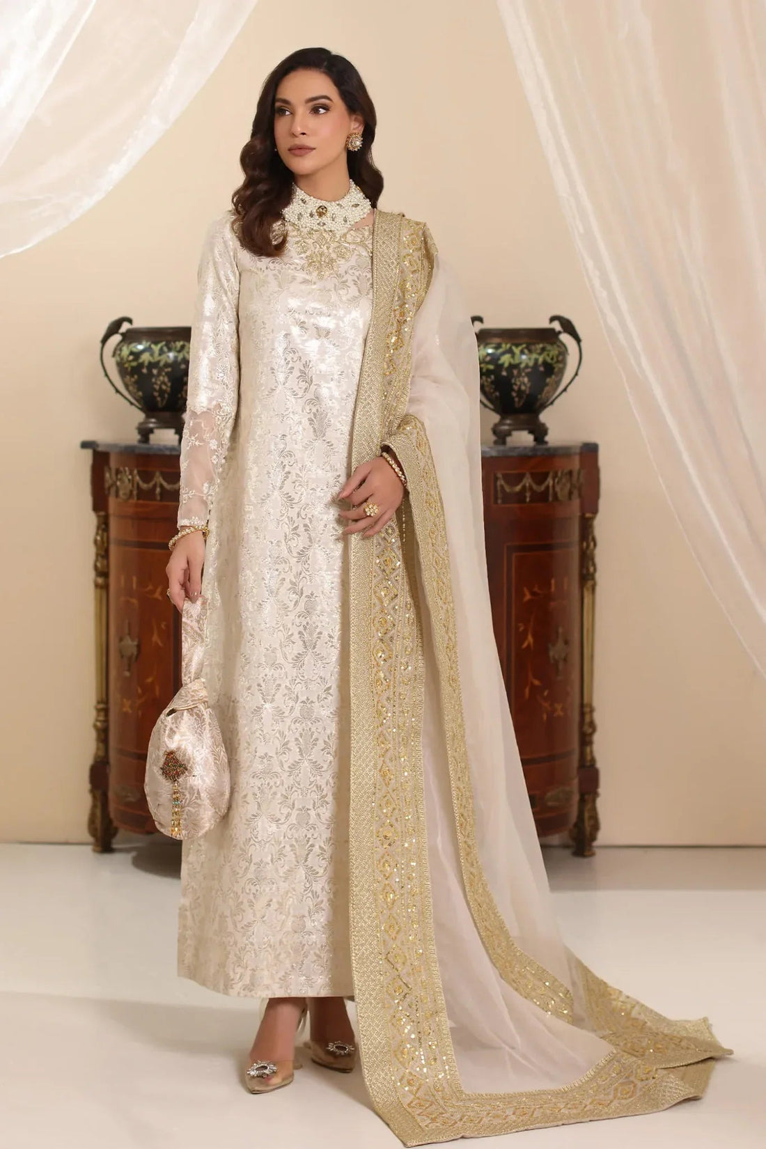 Exuding sophistication, ivory stardust is a vision of grace and elegance. The intricately embroidered tilla...