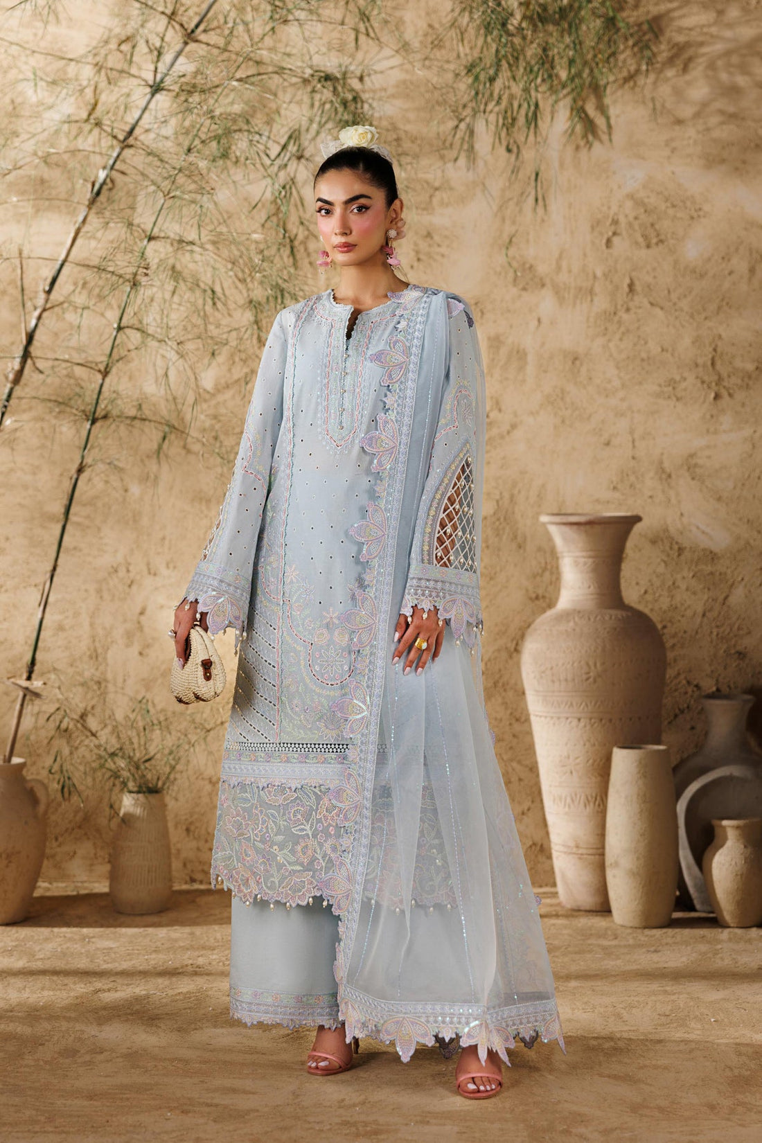This three-piece ensemble features a fully embroidered crinkle shirt with sleeves, adorned with embellishments, cutwork...