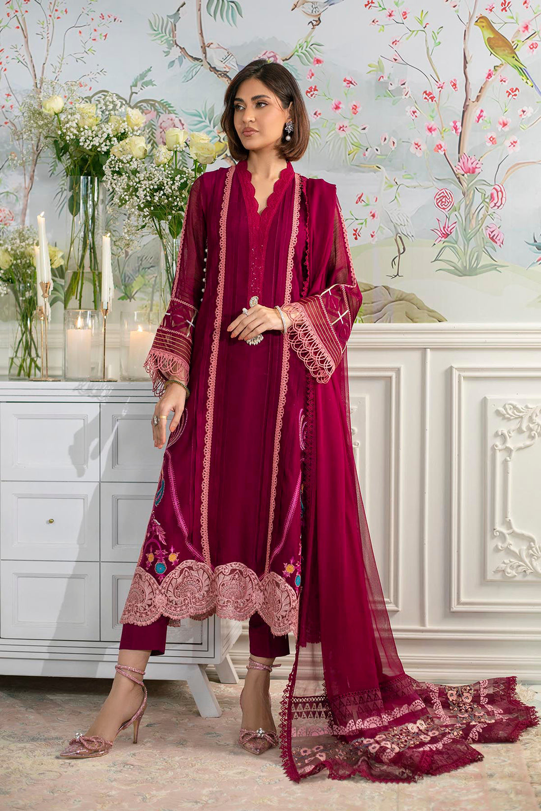 A long shirt presented in a distinguished deep cranberry, featuring contrasting blush accents, pleats, and...