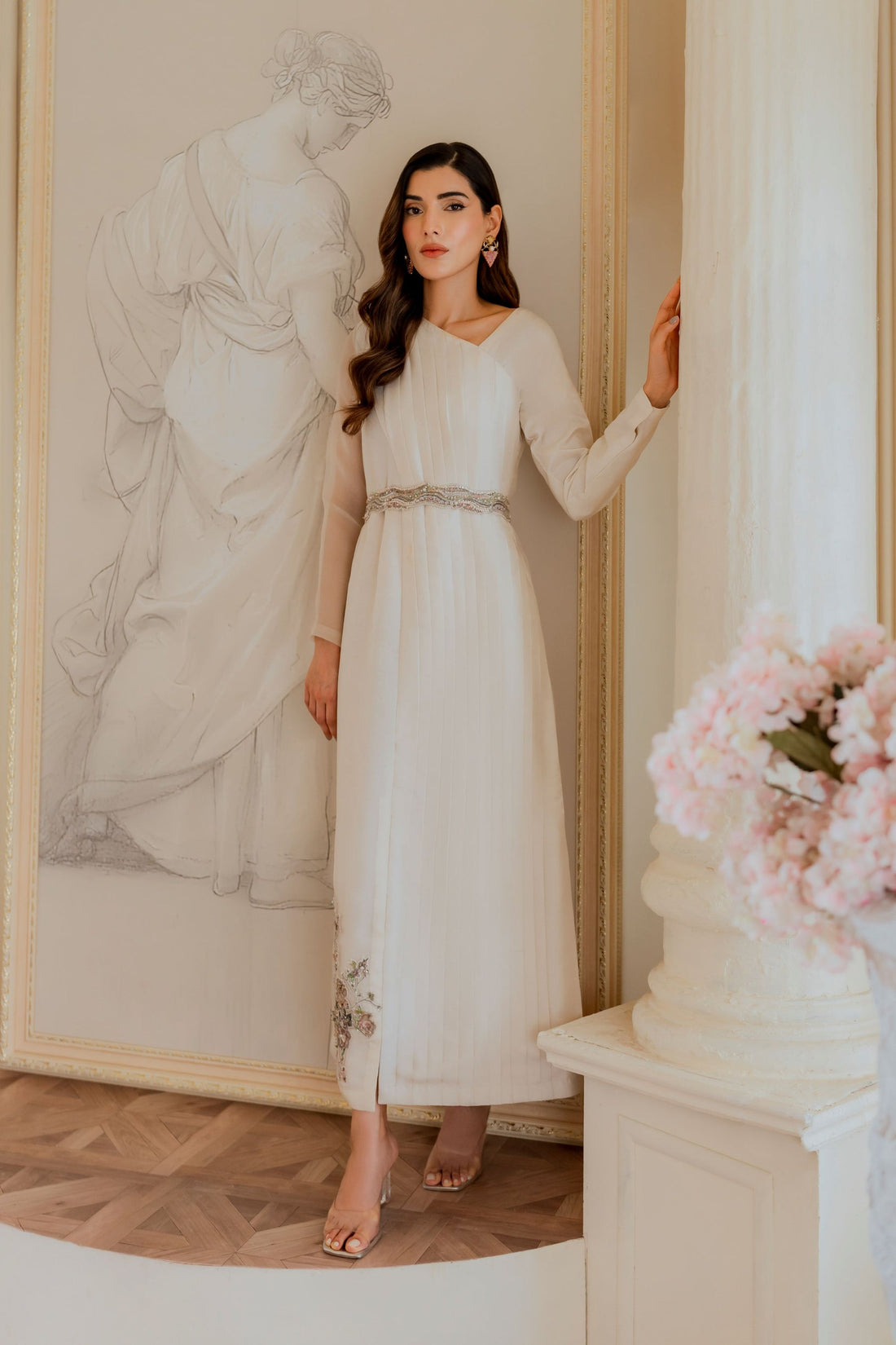 The beautiful off-white dress with an electric blend of pleated organza and raw silk is...