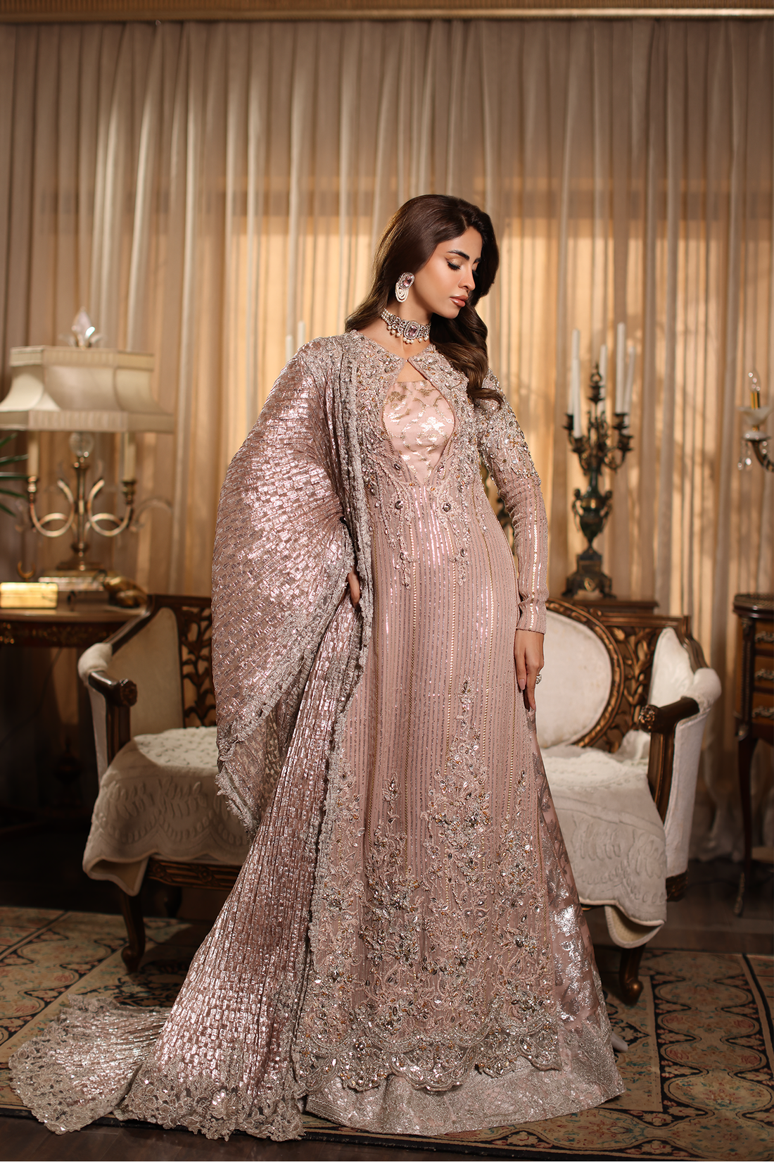Our powder pink 'ELLE' Gown Set is magnified with a captivating interplay of alluring luxury...