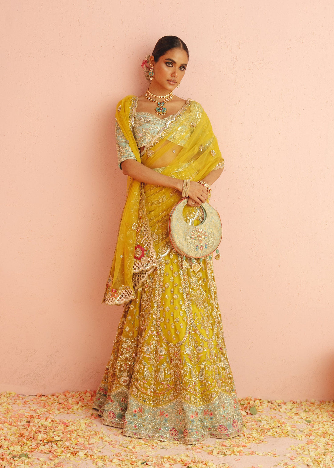 Safiyah - an elegantly worked aqua choli juxtaposed against a yellow lehnga and dupatta. The...