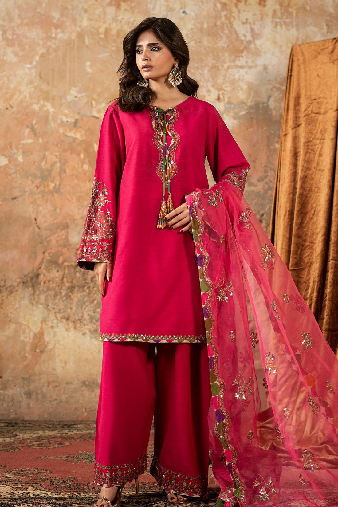 Hot Pink Raw Silk Embroidered 3-Piece Suit Make a bold, festive statement in this striking...