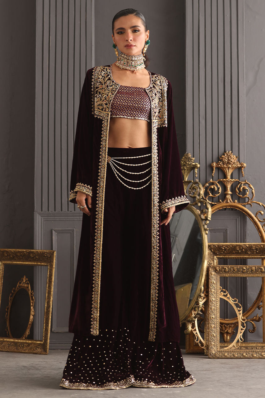 A timeless grandeur rich burgundy velvet paneled jacket adorned with intricate heritage zardozi work across...