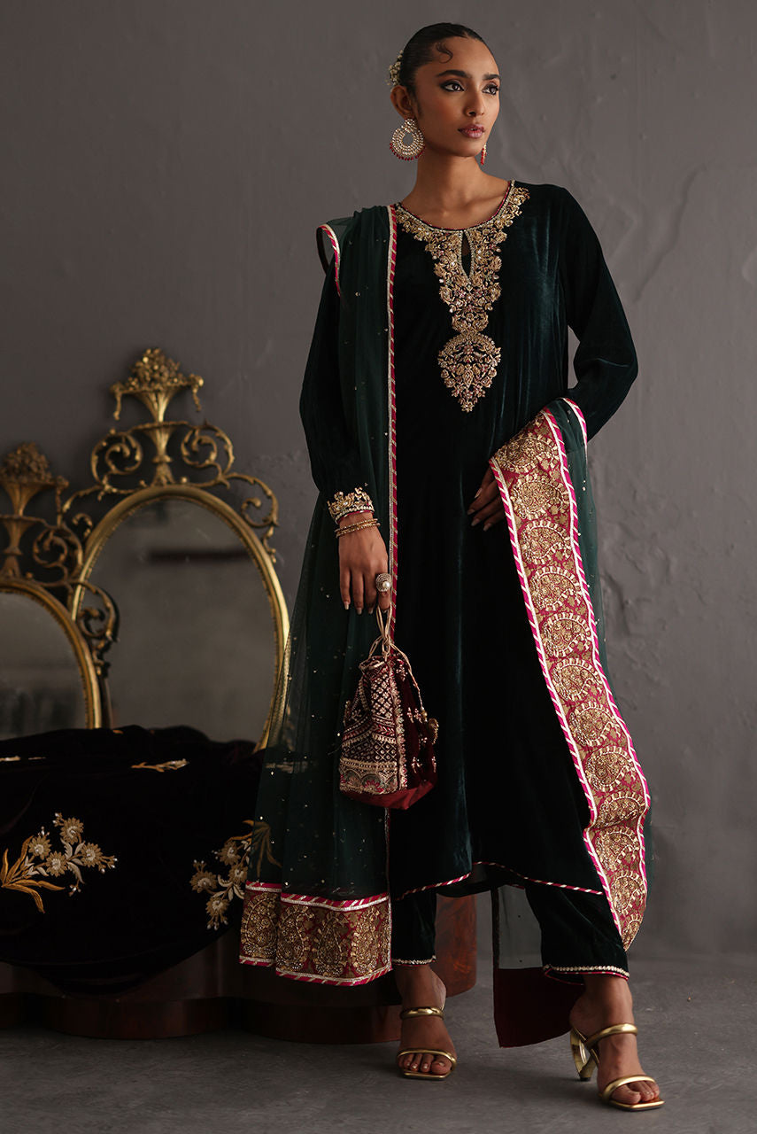 A forest green velvet ensemble with magenta accents, featuring exquisite zardozi work on the neckline...