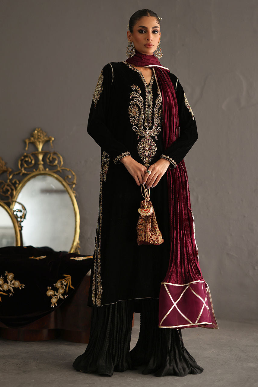 A statement black velvet long kurta adorned with intricate zardozi detailing on the back, neckline,...