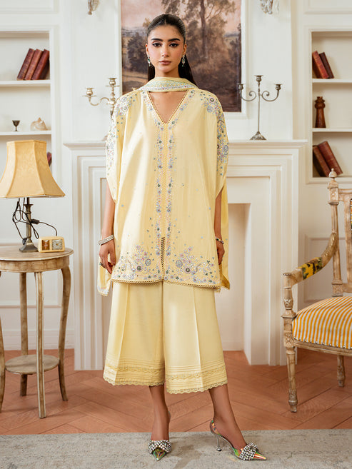 Citrine— a delicate yellow silk semi-formal ensemble, featuring a cape with a refined slit at...