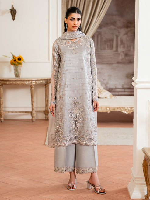 "Glaze” — a sophisticated grey Korean silk semi-formal ensemble, meticulously adorned with intricate thread work,...