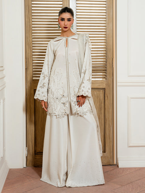 “Haze” — an off-white Tassel silk semi-formal ensemble featuring a long shirt, meticulously adorned with...