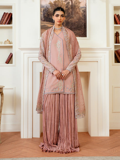 “Vione” — a tea-pink silk semi-formal ensemble featuring a front-open Angrakha-style shirt, exquisitely adorned with...