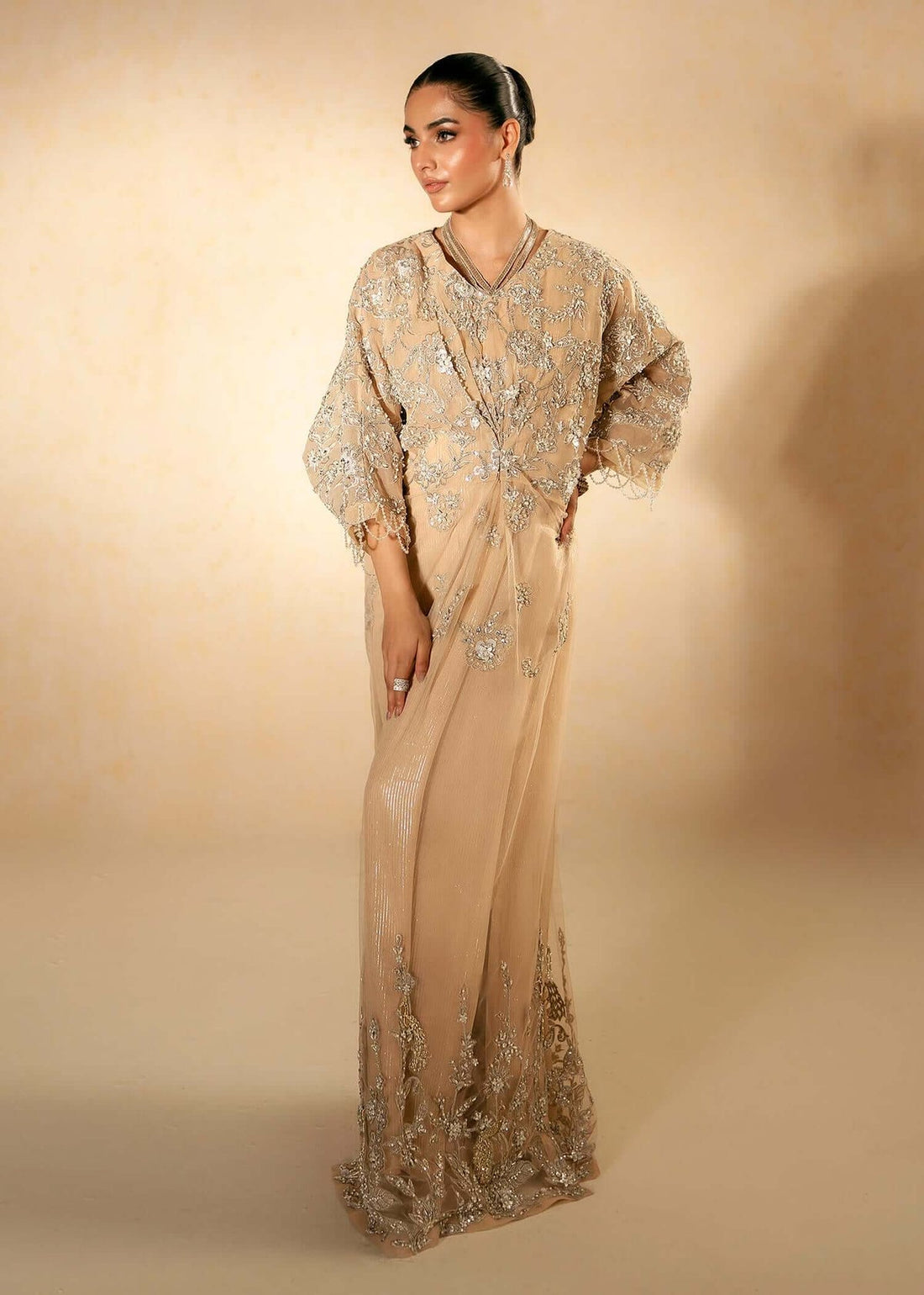 Step into elegance with our Ria Beige ensemble.The tulle net kaftan is designed with a...