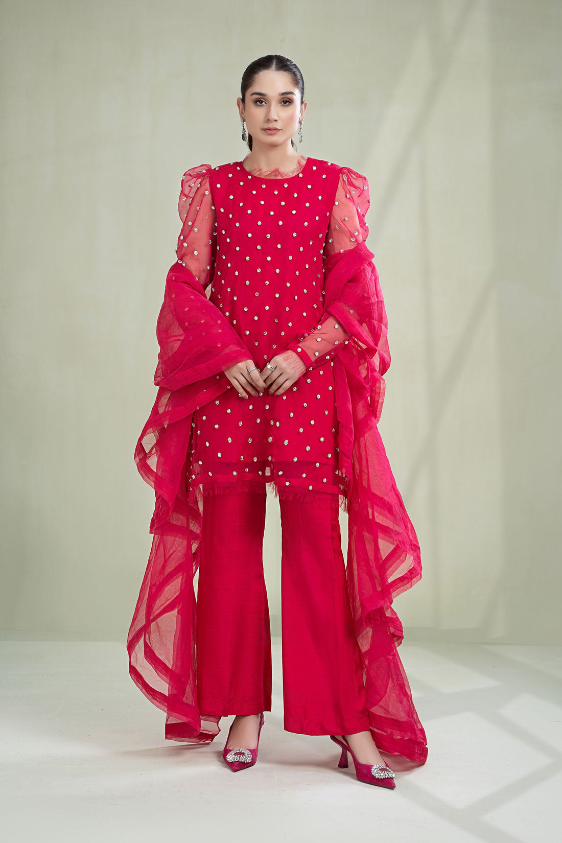 Frock fabric: OrganzaTrouser fabric: Cotton SatinDupatta fabric: OrganzaUndershirt fabric: Cotton SatinLong panelled frock with chickenkari...