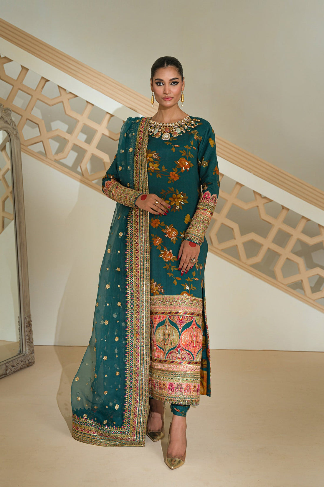 The timeless look is completed with screen printed shirt & gharara paired with net embellished...