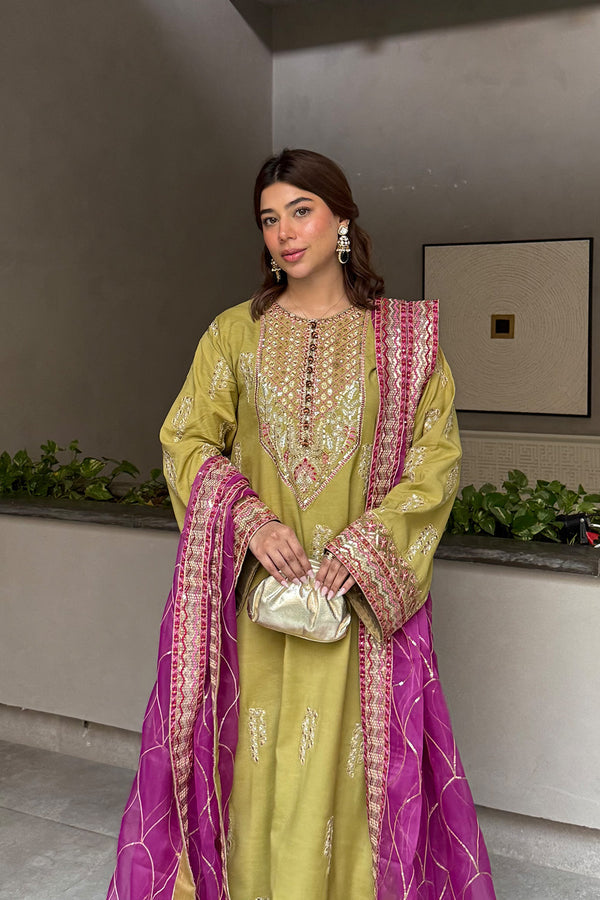Experience luxury like never before with “Vesper”, a majestic olive green ensemble featuring a beautifully...