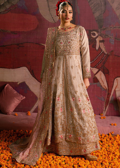 A delicate ivory-gold ensemble adorned with fine embroidery and subtle shimmer throughout. The light, graceful...