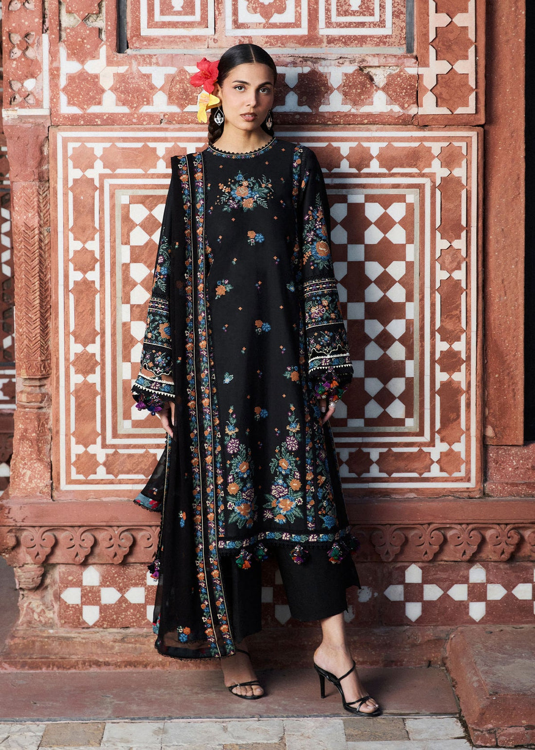A black khaddar shirt, exquisitely embroidered with a vibrant, multi-colored pattern and delicate lace detailing....
