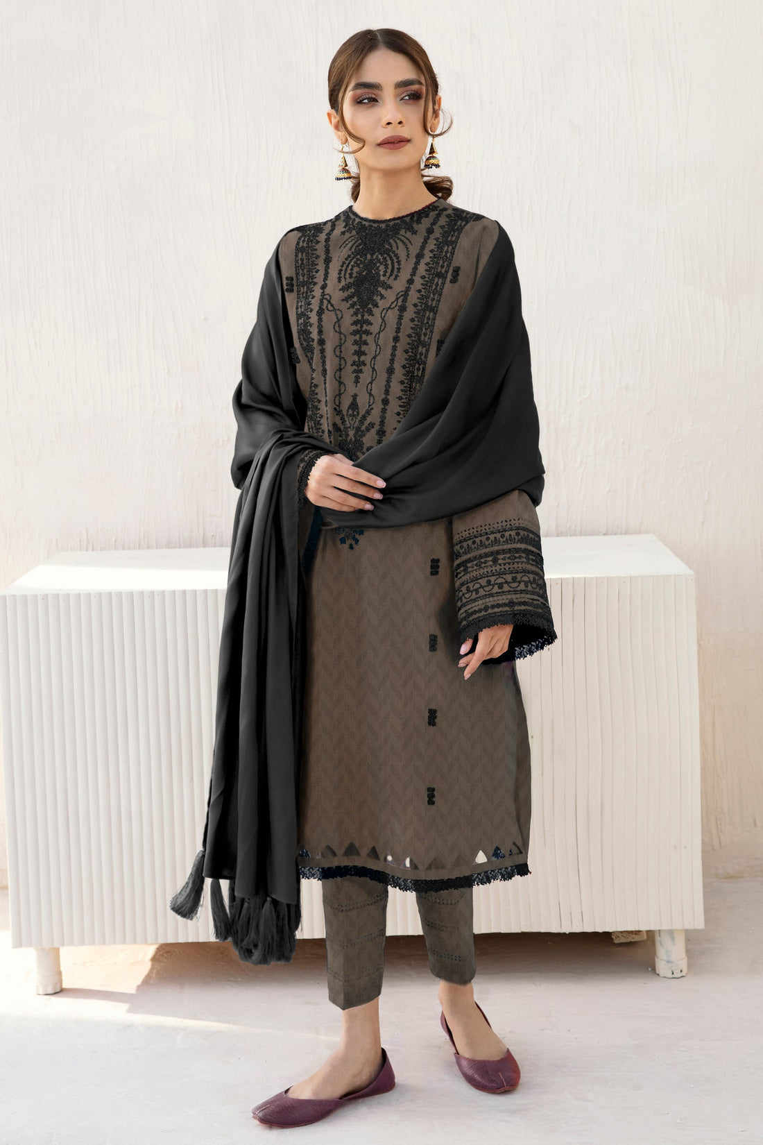 Embroidered Jacquard khaddar Front PanelEmbroidered Jacquard khaddar Left & Right PanelEmbroidered Sleeve BordersDyed Jacquard Khaddar...