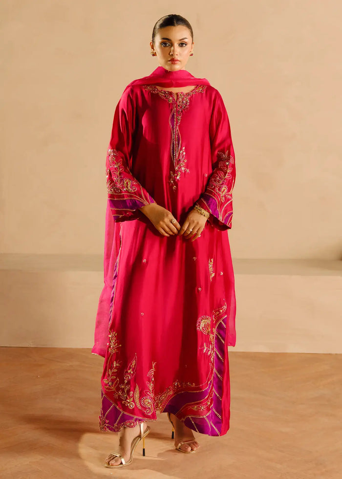 Magenta Marl is a delicate silk set, adorned with vibrant zardozi floral embroidery, gold sequins...