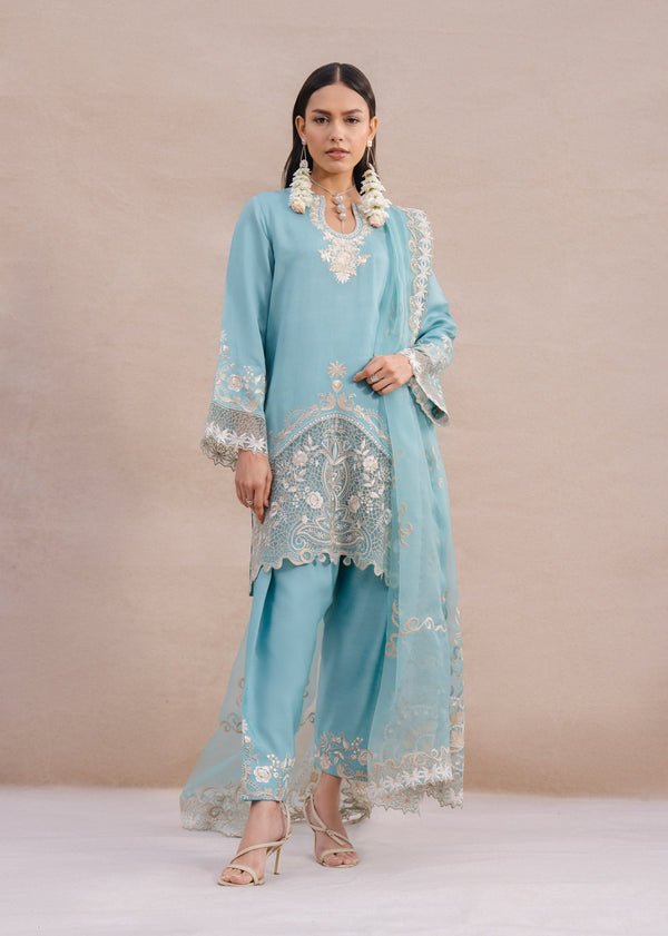 An Ice blue short cotton silk shirt paired with a khari shalwar, embroidered in beige...