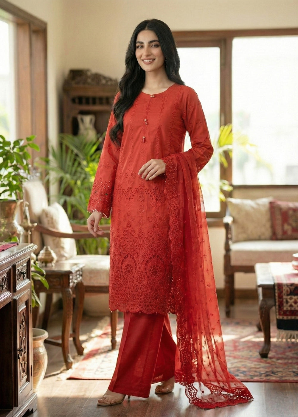 A classic red long shirt adorned with multicolor floral embroidery is paired with beautifully detailed...