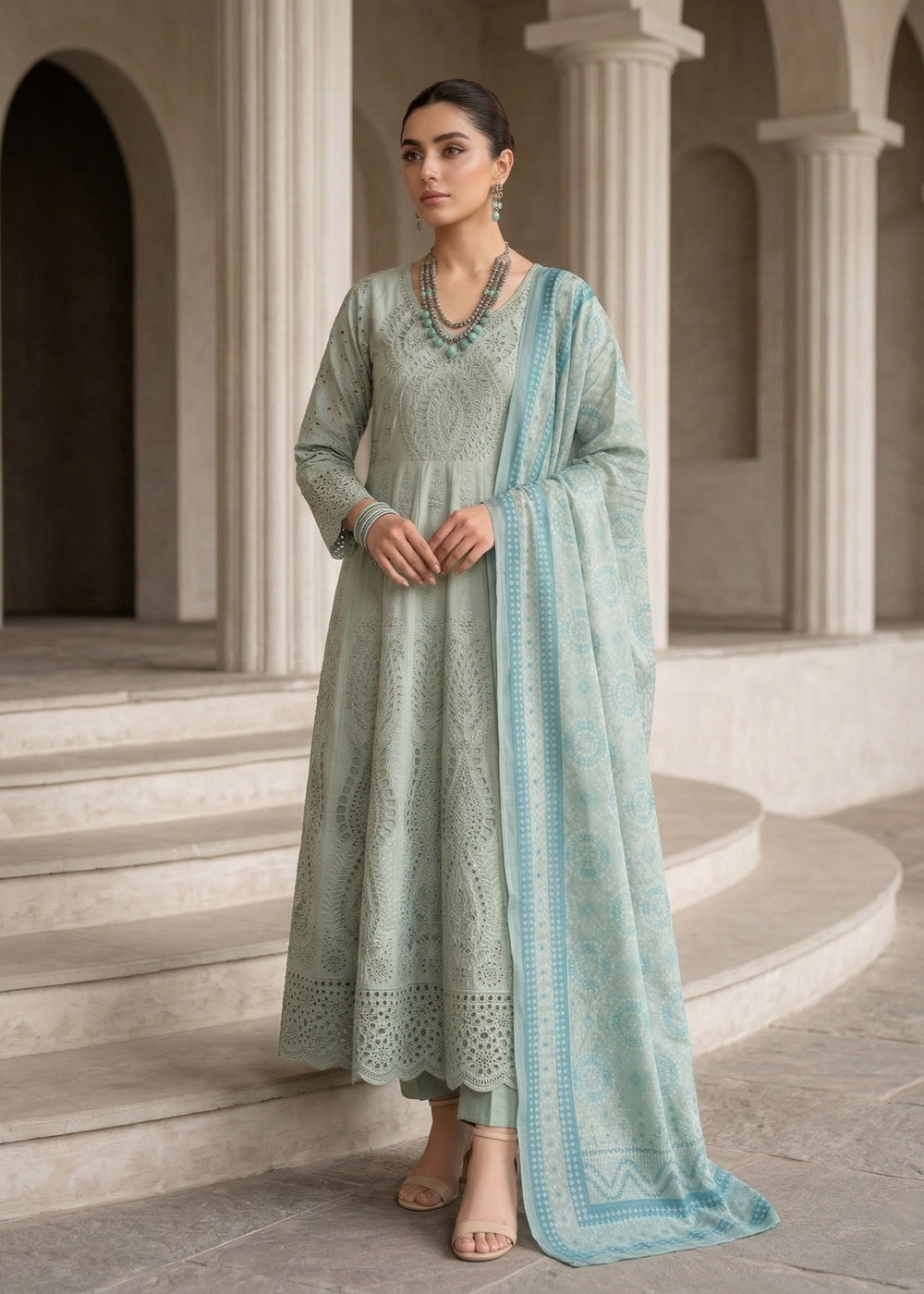 A long mint green shirt adorned with delicate floral embroidery and structured panels is complemented...