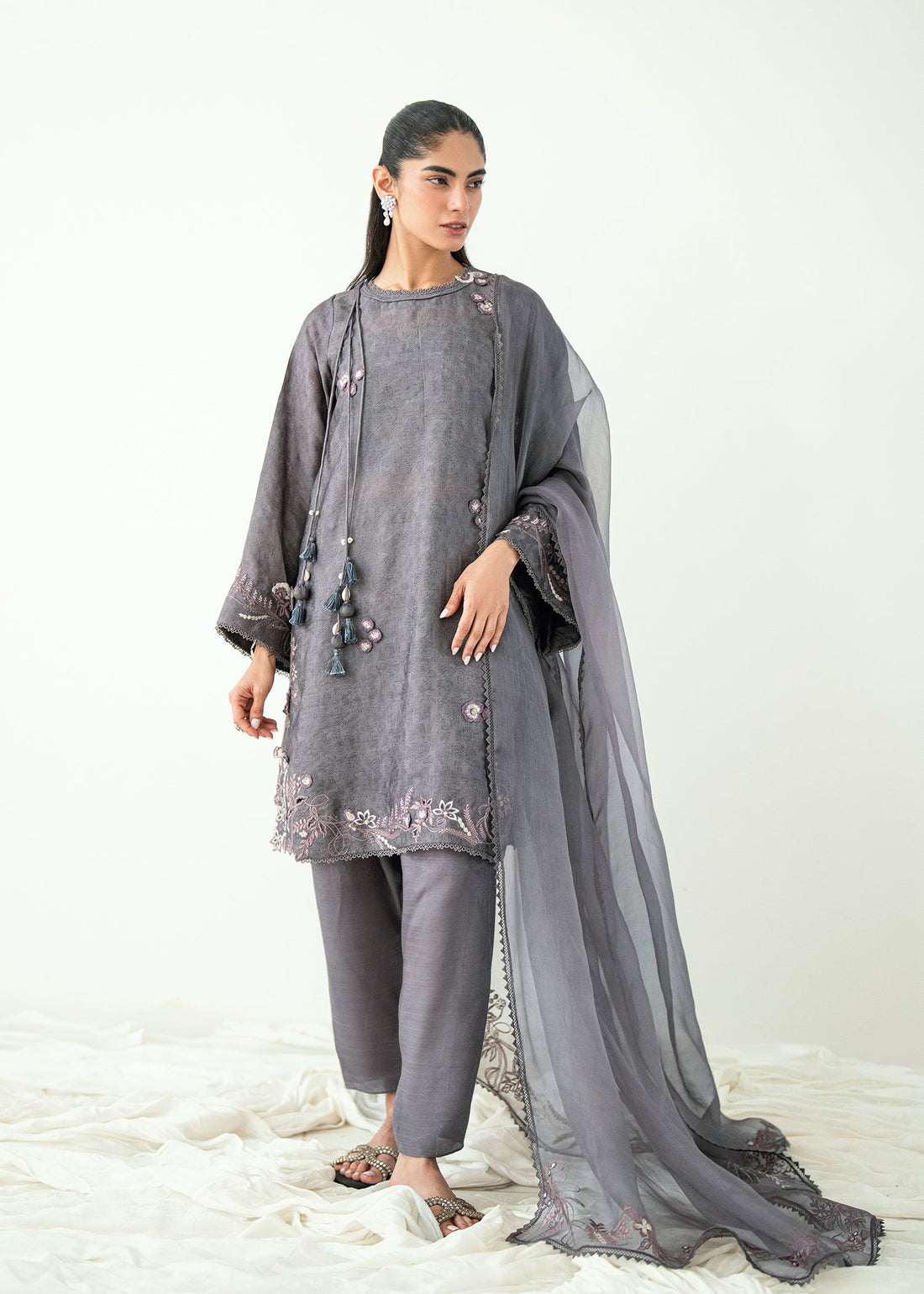 A timeless ensemble crafted in delicate grey shamoos silk, featuring fine embroidery enhanced with subtle...