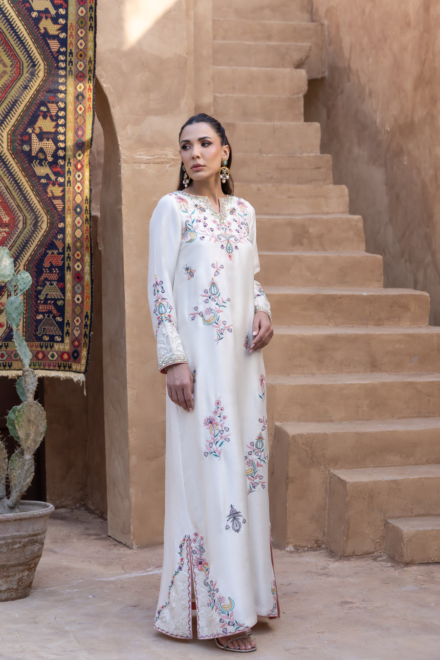 A symphony of dusty rose khaddi corduroy and tonal embroidery, this kaftan embodies refined artistry....