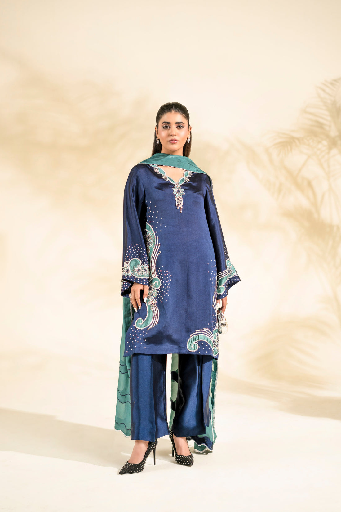 Shirt: Dyed pure sheesha silk shirt with hand embelishmentTrouser: Dyed pure sheesha silk trouserDupatta: Dyed...
