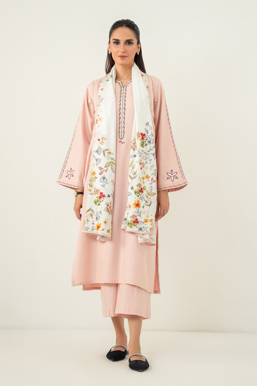 Make a statement in our embroidered pink blended textured karandi A-line shirt paired with viscose...