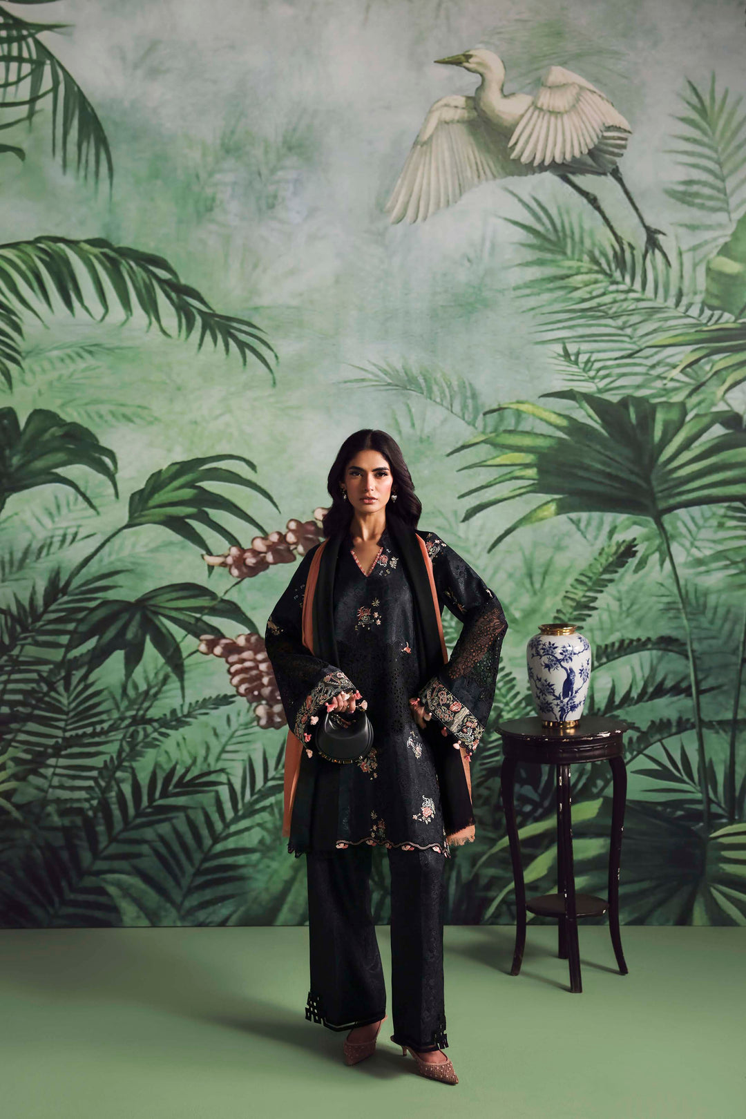 A striking embossed black heavy silk outfit featuring exquisite schiffli and Japanese-inspired embroidery. The richly...