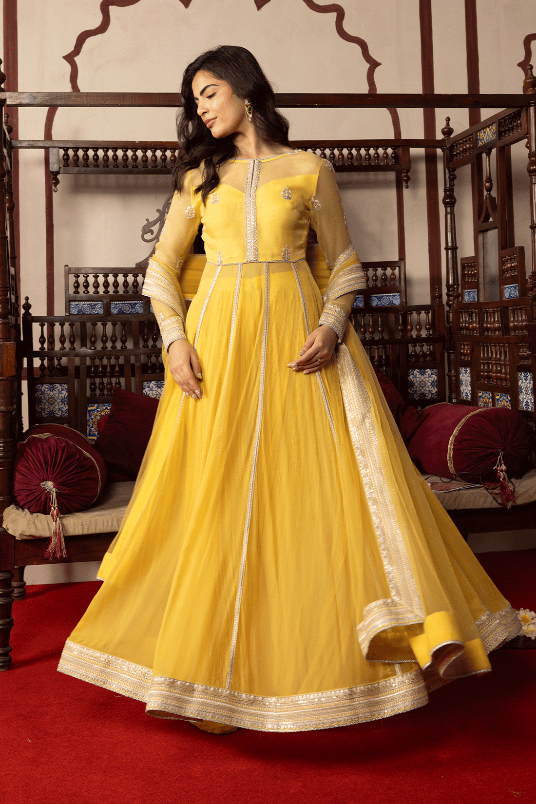 Top: Korean SilkBottom: Korean SilkDupatta: Georgette Chiffon Shafaq is a radiant canary yellow Korean silk...