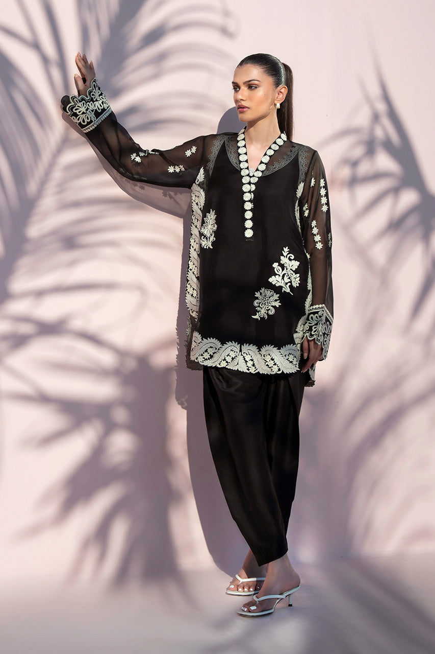 Radiating a luminous, ethereal charm, this ebony hued ensemble features a sheer organza shirt, meticulously...