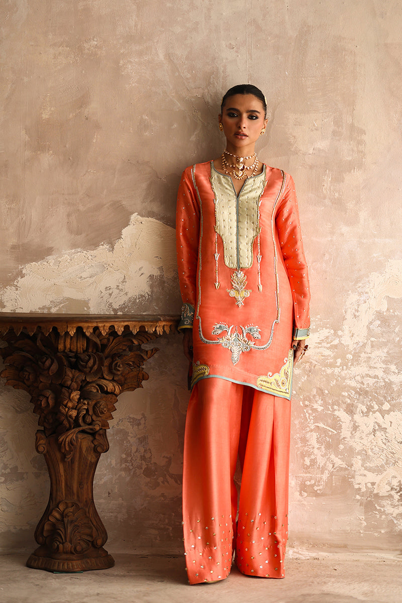 Radiating luminosity, Muzn embraces luxurious surfaces and ornate embellishments. Cut from coral Raw Silk, the...