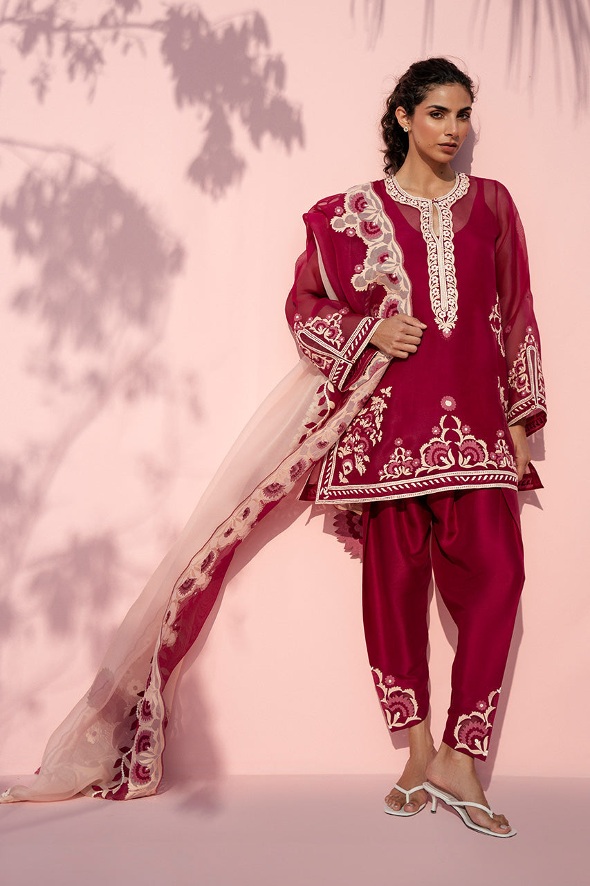 This crimson ensemble is defined by intricate aari embroidery tracing the neckline, sleeves, and hem...