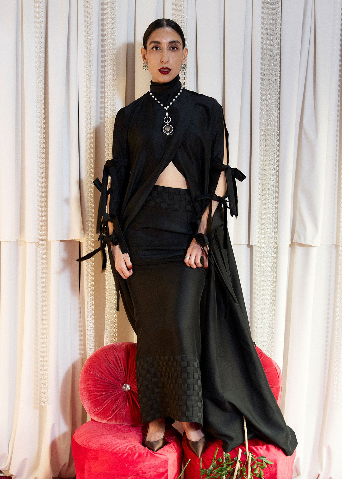 This striking black ensemble is a statement of timeless sophistication and refined elegance. The embroidered...