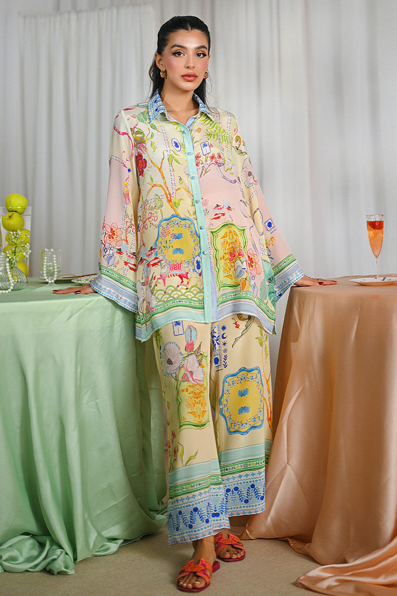 Embrace effortless elegance with 'Poesie' – a stunning co-ord set featuring a delicate lemon button-down...