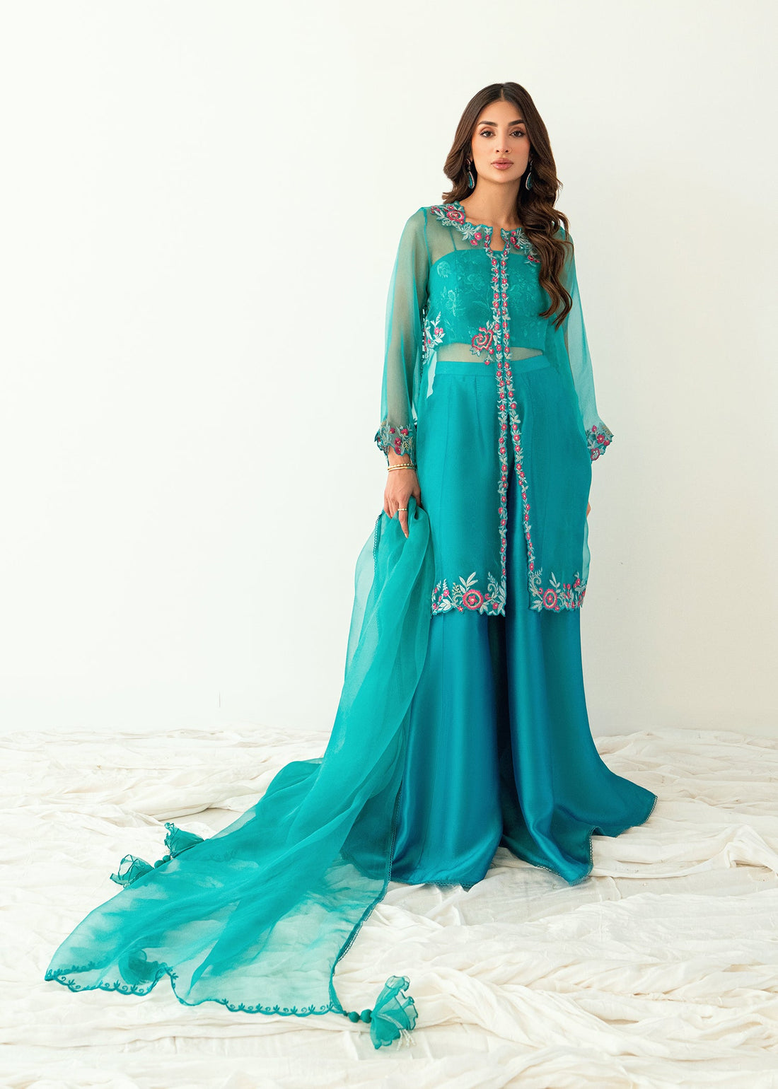 This three-piece ensemble features a heavily embroidered long organza straight shirt with sleeves, designed with...