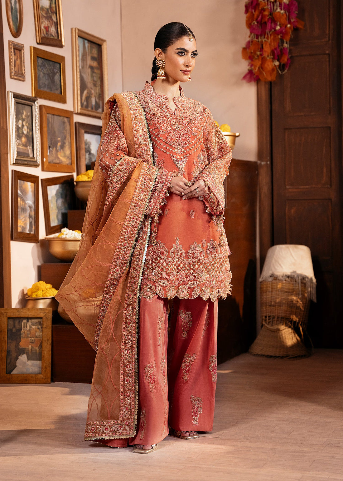 Presenting TARANNUM, a radiant expression of festive elegance in vibrant orange. The embroidered organza shirt,...