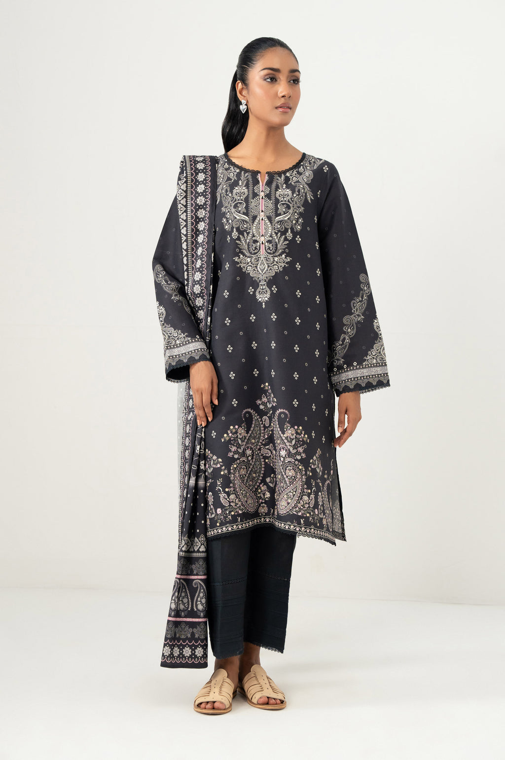 Indulge in elegance with the Moonlit Black unstitched 3-piece embroidered suit. The luxurious Rajjo Net...