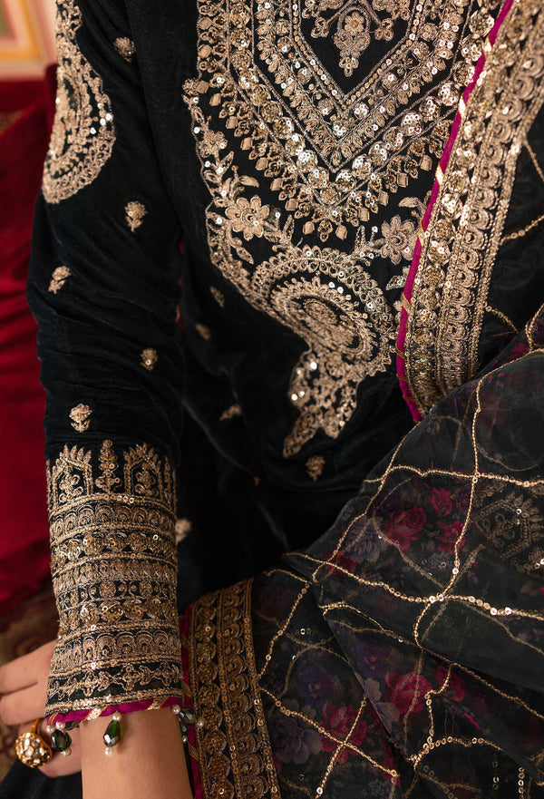 Embroidered Micro Valvet Front Embroidered Micro Valvet Sleeves Embroidered Organza Front Border Embroidered Organza Neck Embroidered Organza Sleeves Border Raw Silk Trouser Embroidered & Printed Organza Dupatta Plain Micro Valvet Back
