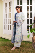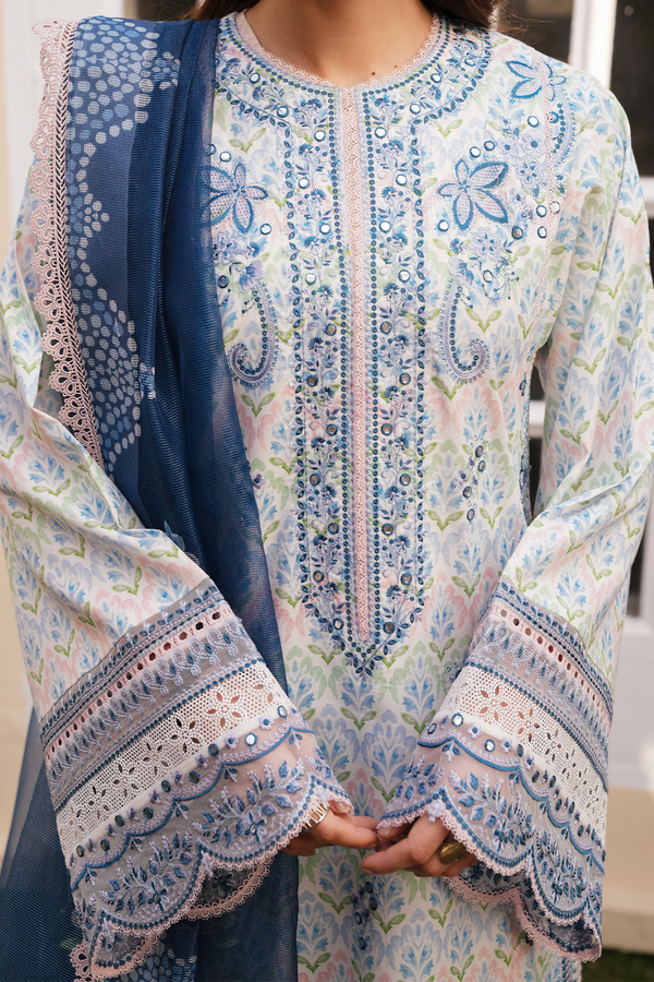 Softly romantic and effortlessly refined, this ensemble features a white printed base layered with a dreamy watercolor print that flows in pastel blues and gentle hues. Delicate embroidery traces the neckline and sleeves, elevated with subtle sheesha work that catches the light with every movement. The matching trousers carry the same gentle print, finished with an embroidered border that adds structure and polish while keeping the look light and cohesive. Paired with a cotton net floral dupatta in a contrasting blue — sheer, fluid, and blooming with detail — the outfit blends freshness with craft, made for moments that call for quiet elegance.