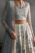 A soft aqua mist and pastel lehenga ensemble featuring a heavily embellished blouse with intricate threadwork and sequins. This voluminous lehenga showcases delicate multicolored pastel embroidery and mirror work paired with a sheer dupatta finished with a scalloped border. A graceful blend of modern elegance and timeless charm — perfect for receptions and day weddings.