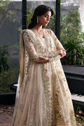An opulent off white front open shirt intricately embellished with gold threadwork, sequins and detailing. Paired with a voluminous lehenga and a sheer dupatta featuring ornate borders. This ensemble exudes timeless grandeur — perfect for nikkah receptions in elegance.