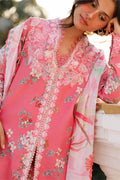 A vibrant coral-pink ensemble that radiates warmth and freshness, brought to life with delicate floral prints scattered across the surface. The rich pink base is softened by pastel blossoms and fine embroidery that trace the neckline, sleeves, and hem, adding depth without overpowering the colour. The long, fluid silhouette falls effortlessly, creating an elegant line with subtle movement. A sheer dupatta in complementary tones of blush and soft aqua introduces contrast, its printed motifs and patterned border lending lightness and flow. The colour evokes a sun-kissed charm — lively yet refined — making the ensemble feel graceful, feminine, and perfectly suited for bright daytime occasions.