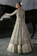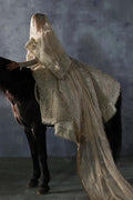 The peshwas, crafted from opulent khadi net, is a vision of timeless elegance, adorned with lavish silk thread embroidery and intricate embellishments. Its zari net sleeves, featuring delicately embellished motifs and borders inspired by contemporary designs, add a modern touch to this classic silhouette. Completing the look is a breathtaking khadi net dupatta, enriched with heavy sequins, pearl tilla, and cutdana work, exuding unmatched sophistication and charm.