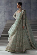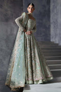 Give yourself over to the splendour of a lavishly embroidered bridal gown that is masterfully made from luxurious organza. A true masterpiece, this gown is meticulously designed to exude regality and timeless charm. Featuring a front-open style, it is enriched with intricate hand embellishments, including beadwork, pearls, and cut dana details. The bodice, adorned with heavy embroidery and a beautifully crafted square neckline, adds to its grandeur. Completing the ensemble is a royal organza dupatta, lending an ethereal touch to this enchanting bridal look.