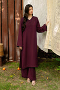 Mehroon Set Includes an solid shirt pants with the V neckline embossed with laces - Pure premium karandi with a subtle sheen produced in-house!