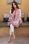 White and red embroidered karandi lawn outfit with a striking maroon block print chiffon dupatta. A perfect blend of comfort and style.