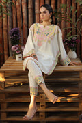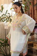 Off-white baggy shirt with intricate embroidery, paired with matching embroidered pants for a stylish, coordinated look